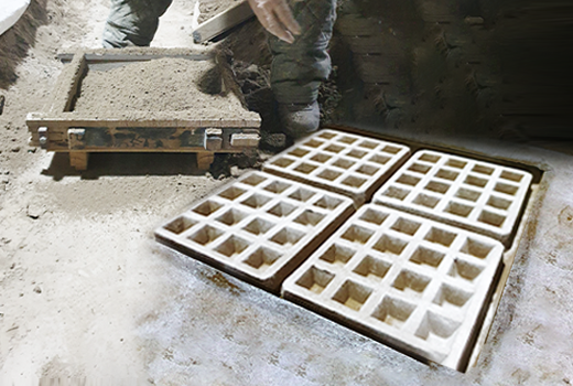 - 목형으로 흙으로된 몰드를 찍어냅니다. 목형 한 개로 반복적으로 몰드를 찍어낼 수 있습니다.